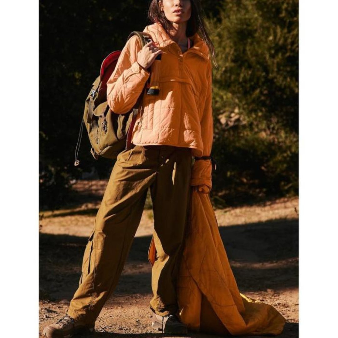 Quilted, insulated construction. Oversized silhouette. Hooded pullover style. Lightweight warmth.