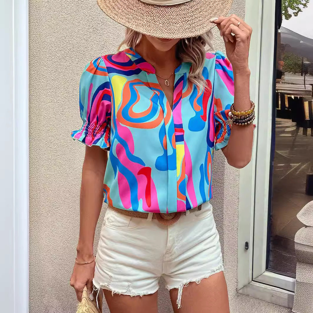Out-Shine | Abstract print puff sleeve short shirt