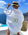 An ideal combination of sophistication and laid-back style. This top showcases an oversized silhouette adorned with a captivating sequin and bead pattern on the back, featuring a dazzling eye design.